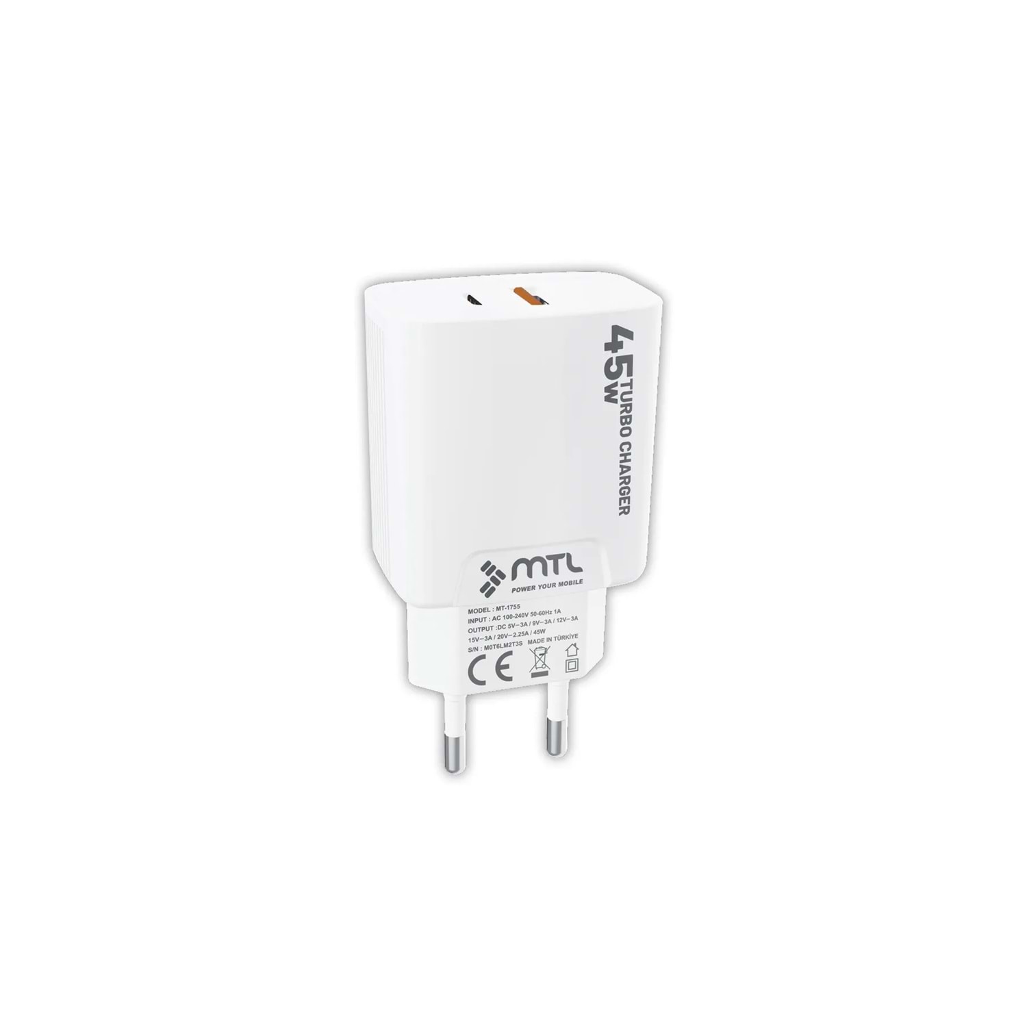 MTL MT1755 45W QC4.0 Süper Turbo PD Type-C Port + USB Port Çift Giriş Ev Şarj Adaptörü