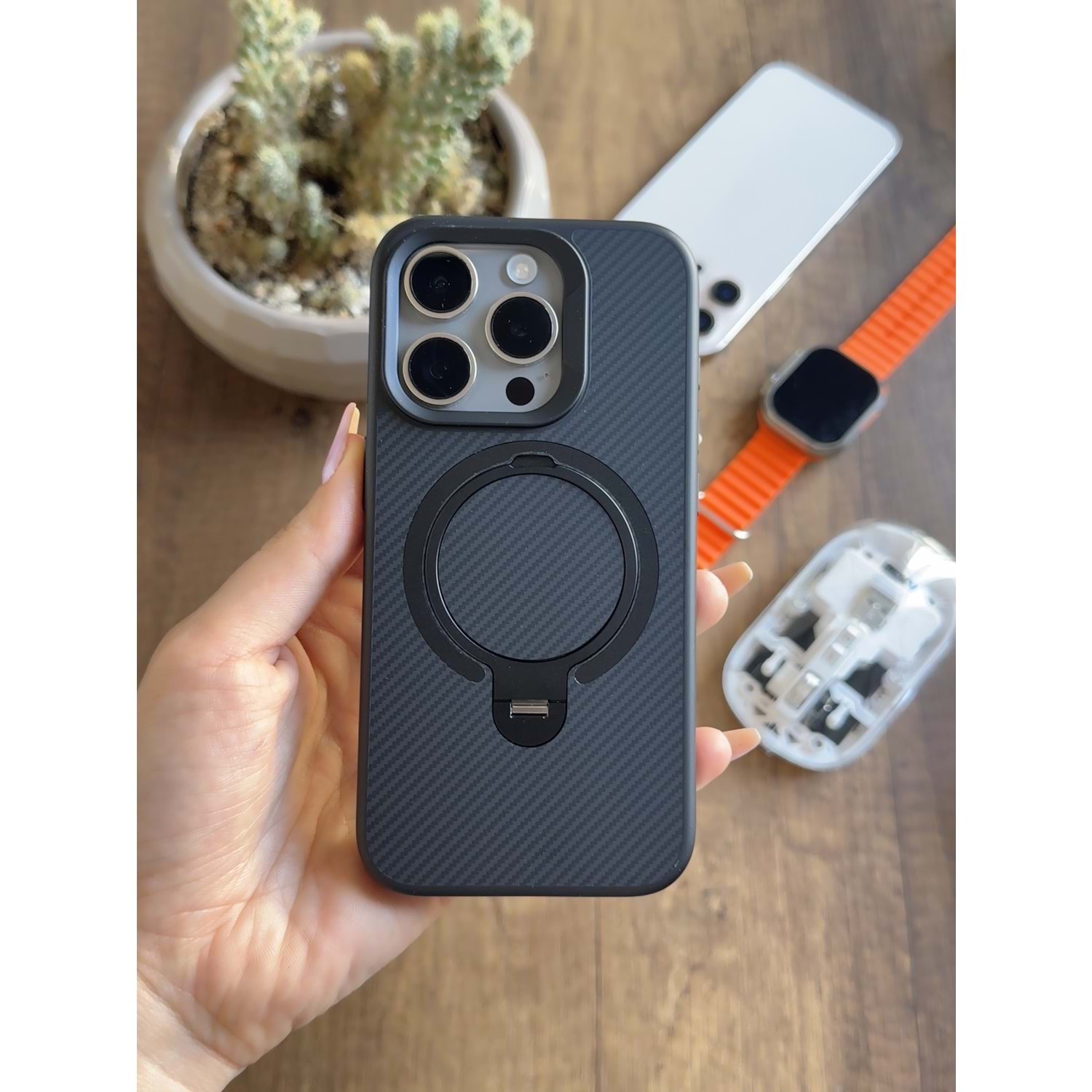 SOO-700 Magsafe Uyumlu Standlı Karbon Silikon Kılıf, hem şıklığı hem de çok yönlü kullanımı bir arada sunar. Magsafe teknolojisi ile tam uyumlu olması sayesinde kablosuz şarj ve Magsafe aksesuar kullanımını destekler. Karbon desenli şık yüzeyi, modern ve sportif bir görünüm kazandırırken parmak izi tutmaz ve çizilmelere karşı dayanıklıdır.