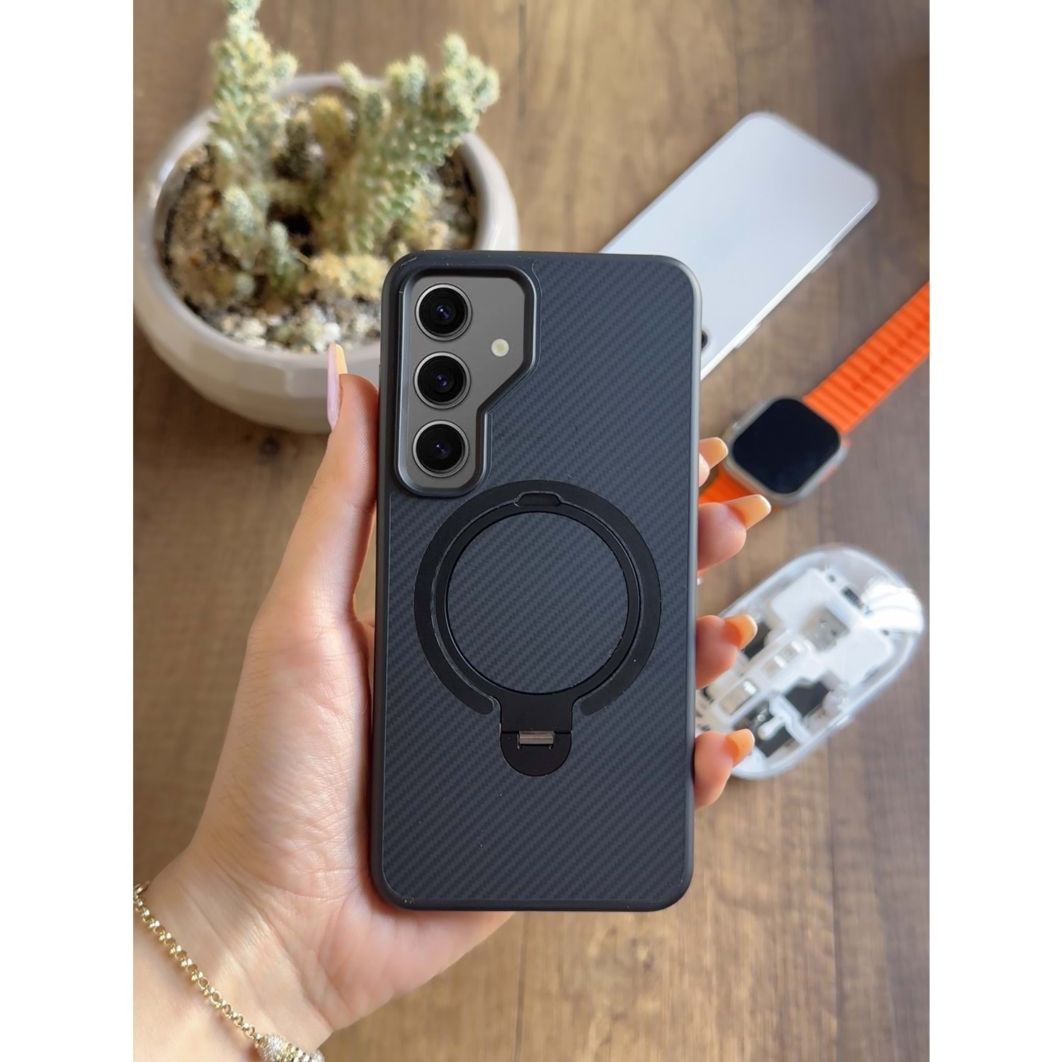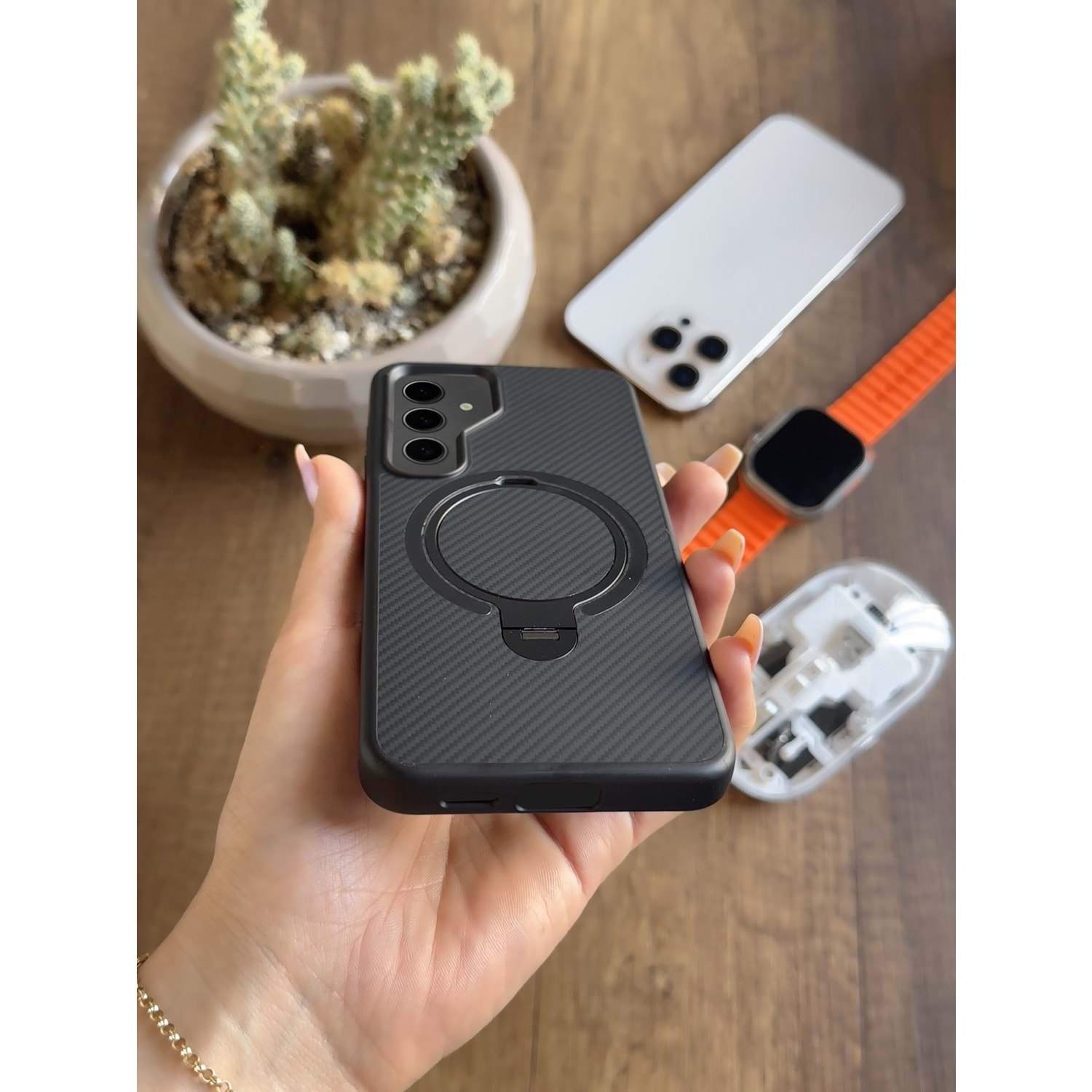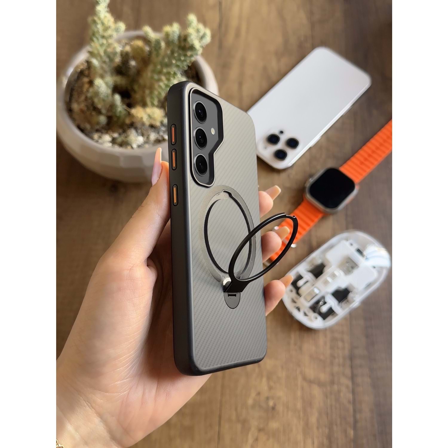 Kılıfın arkasındaki 360° dönebilen stand/halkalı tutucu özelliği, cihazınızı dikey veya yatay konumda güvenle kullanmanızı sağlar. Böylece video izlerken, görüntülü konuşmalarda veya oyun oynarken ekstra rahatlık sunar. Silikon yapısı ve iç kısmındaki koruyucu kaplama, cihazınızı düşmelere ve darbelere karşı etkili bir şekilde korur.